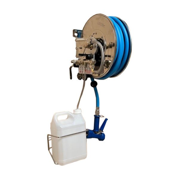 Enrouleur inox avec kit de dosage intégré – 1 produit – Tuyau 11 mètres 1. Équipement professionnel sélectionné par Harmony Distribution.